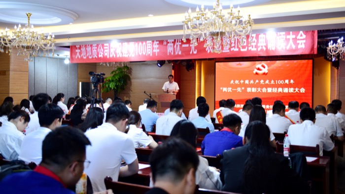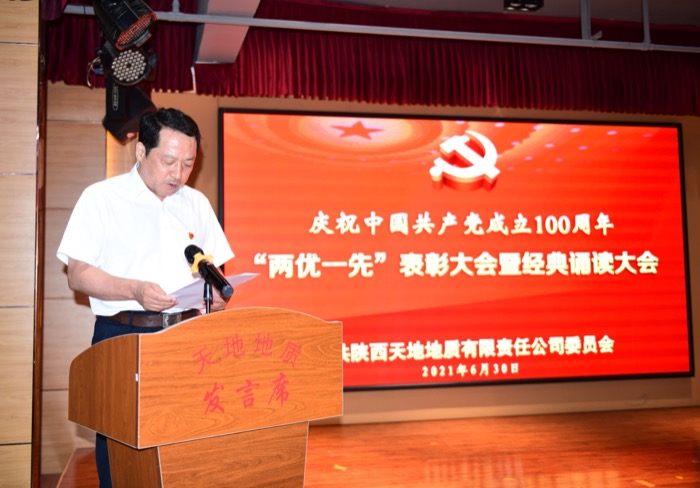 2021年是中国共产党百年华诞。百年征程波澜壮阔,百年初心历久弥坚。6月30日下午,天地地质公司在唐都大厦会议室召开了庆祝建党100周年“两优一先”表彰暨红色经典诵读大会。公司党委书记、董事长、总经理姬永涛作大会讲话,党委副书记、纪委书记秦缠民主持大会。公司领导班子,全体党员干部及各部门、工程公司职工代表,共计80人参会。